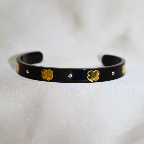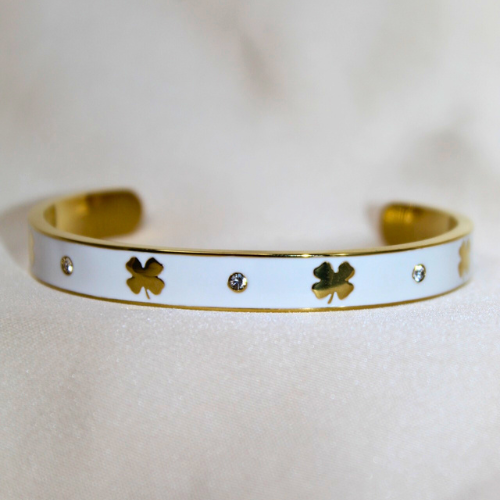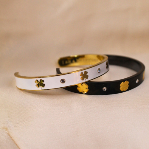 The Overflow Bracelet features gold clovers with black or white enamel, accented by 2mm zirconia stones.